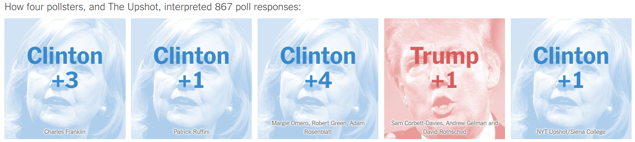 Pero no les quito toda la razón. En $f$ hay opinión, hay sesgo y, cómo no, error. Un artículo muy revelador al respecto es We Gave Four Good Pollsters the Same Raw Data. They Had Four Different Results. en el que se describe el experimento que el titular da a entender.