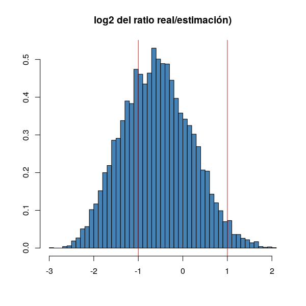 Lo que podemos hacer es generar muchas secuencias de secuencias de números, aplicar el triquito a cada una de ellas y comparar el producto real con el estimado. Para secuencias de tres números (entre 1 y 10), se obtiene la siguiente distribución del log2 de los cocientes: