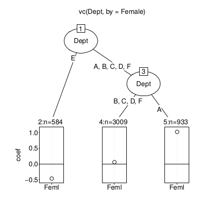 Pero también, ¿por qué no?, con árboles. Eso hace el paquete vcrpart de R. Con él, uno puede decirle al modelo: tal variable depende de estas otras y créame el típico árbol (al estilo de ctree o mob en party) que aproxime la relación funcional. Lo que permite estudiar muy concretamente el efecto de los moderadores en el impacto de una variable, etc.