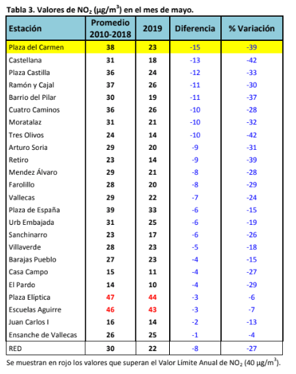 Resultan destacables los datos correspondientes a Plaza del Carmen, la única estación de la red ubicada dentro del perímetro de Madrid Central. En mayo de 2019 el valor alcanzado en Plaza del Carmen, 23 µg/m³, fue 18 µg/m³ inferior (reducción del 44 %) al registrado en 2018, y 8 µg/m³ inferior (reducción del 26 %) al registro correspondiente a los años con menor contaminación, 2013 y 2014.