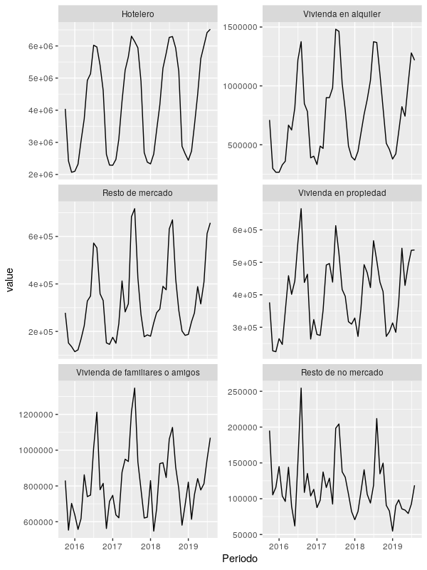 (Cuidado al leer la escala de los distintos ejes: las pernoctaciones en hoteles son superiores casi de un orden de magnitud al resto).
