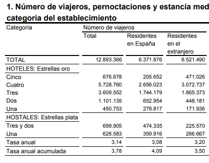 ¿Cuál? Frontur, la estadística de movimientos turísticos en frontera del INE. (Sin enlace: los enlaces del INE van y vienen). Las cifras de Frontur proceden de encuestas a turistas que salen de España a los que se somete a un cuestionario y cuyos resultados se extrapolan al total de la población extranjera que circulan por las fronteras. Así que, a diferencia de la estadística de ocupación hotelera (donde el INE solo adquiere información de turistas que pernoctan en hoteles), en esta encuesta son los turistas, independientemente de donde hayan dormido, los que dicen dónde lo hicieron. Y los resultados son estos:
