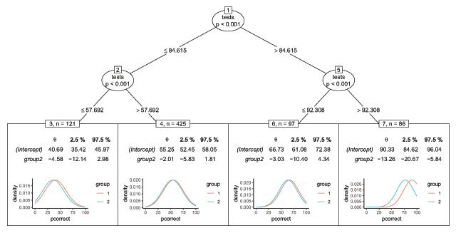 Esto se podría resolver usando interacciones, algún tipo de selección de variables,… yo qué sé. O usando model4you, un paquete hermano de party y otros similares, que permite construir cosas como