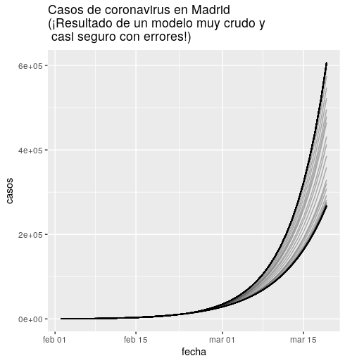 ggtitle("Casos de coronavirus en Madrid\n(¡Resultado de un modelo muy crudo y\n casi seguro con errores!)")