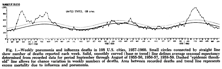 usando una tendencia lineal y una sinusoide para la estacionalidad intraanual (véase, p.e., Observations on excess mortality associated with epidemic influenza de 1961 nada menos). Eso se lleva haciendo desde principios de los sesenta, como poco, cuando utilizar senos y cosenos en una regresión tenia que haber sido tecnología casi alienígena. Y no, el valle nunca ha estado en primavera sino en verano.