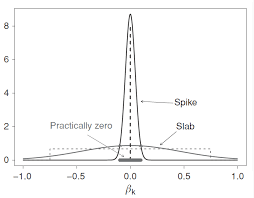 Otra de las técnicas disponibles es la del spike and slab (de la que oí hablar, recuerdo, por primera vez en el artículo de Varian Big Data: New Tricks for Econometrics). Es una técnica de inspiración bayesiana en cuya versión más cruda se imponen sobre las variables del modelo de regresión prioris que son una mezcla de dos distribuciones: