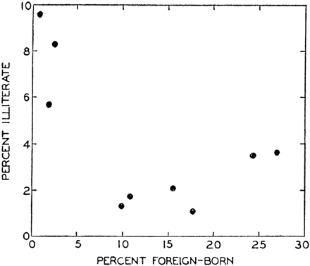 Dice la Wikipedia que la primera denuncia de luego conocida como la falacia ecológica hay que buscarlos en Ecological Correlations and the Behavior of Individuals de un tal W. S. Robinson. Cuenta, entre otros ejemplos, cómo existía una correlación positiva entre ser inmigrante y ser analfabeto (según el censo de 1930 de EE.UU.), evidenciada por la tabla