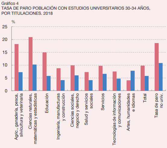 Es esto, que contiene un gráfico, el cuatro, donde compara la tasa de paro de los estudiantes de diversas especialidades españoles (barra roja) con los de la media de la zona euro (azul),