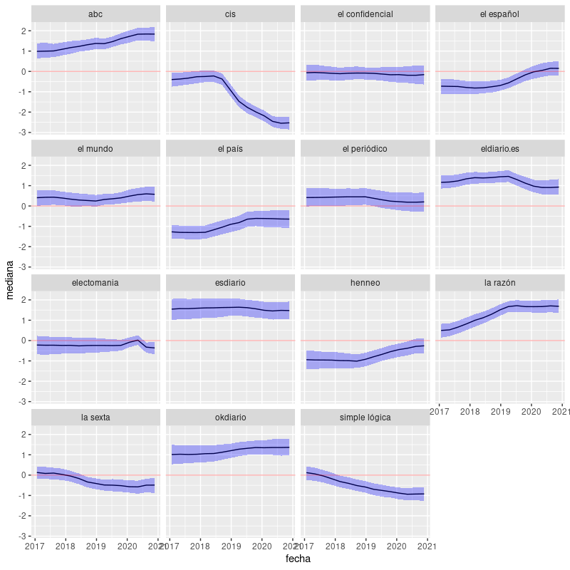 (El gráfico anterior muestra la evolución del sesgo aparente en las propensiones de voto al PP de los medios que más encuestas electorales han publicado en los últimos tiempos acompañado de su correspondiente intervalo de credibilidad del 50%.)