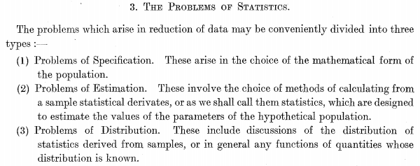 Obviamente, discrepo —aunque dejo la crítica para otra ocasión—, pero se le abona a Fisher la claridad. Más adelante, Fisher enumera ls tres subproblemas asociados a la reducción de los datos: