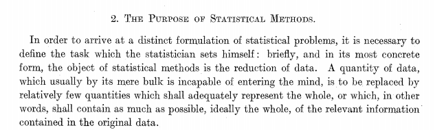 Entonces, ¿por qué la suficiencia? Escuchemos (leamos) lo que Fisher tiene a bien decirnos. En primer lugar, sobre lo que la estadística es y —aunque viene a ser lo mismo— para lo que sirve: