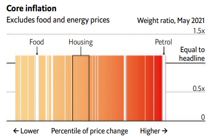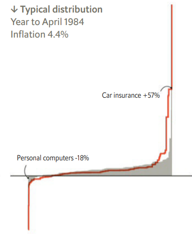 Trae The Economist en su número del 6 de noviembre (de 2021) un artículo al respecto que tiene cierto interés estadístico. Comienza comparando la inflación de ahora con la de otros años donde el incremento de los precios fue, de acuerdo con cómo se computa tradicionalmente la inflación, igual, a través de la distribución de los incrementos de precios sobre las distintas categorías: