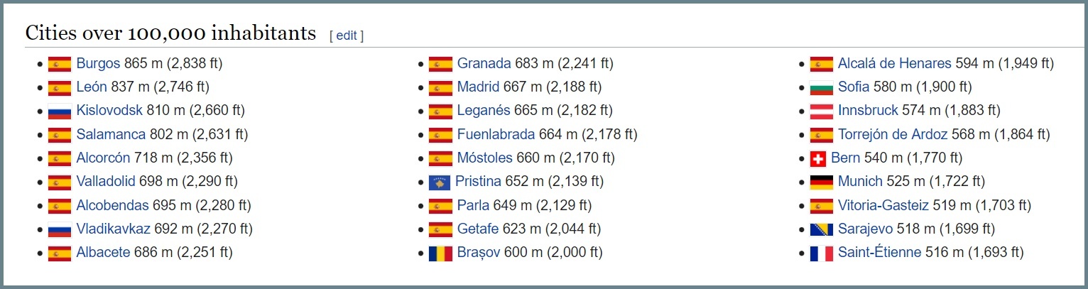 - Que España tiene grandes extensiones de terreno llano a gran altura, las mesetas.De hecho, siempre había oído hablar —spoiler: como se verá, es información o incierta o desfasada— que España es el segundo país de Europa en altitud media.