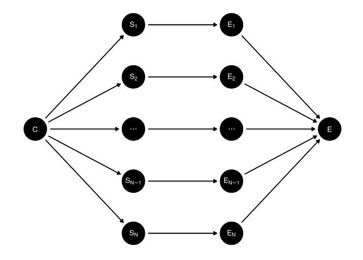 (que, de nuevo, puede estar decorado con variables confusoras, etc. adicionales) donde los $S_i$ son sujetos que conforman una población determinada y para cada uno de los cuales la causa $C$ induce un efecto parcial $E_i$. Estos $E_i$ quedan luego subsumidos en una variable macro $E$ —que podría ser en muchos casos una estimación de su suma—.