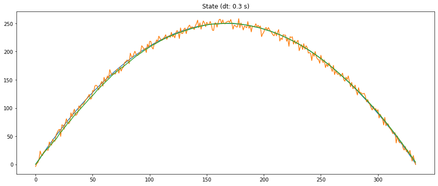 x0 = np.random.multivariate_normal(x0_mean, x0_cov, 10000)Finalmente, la trayectoria estimada vía Kalman,