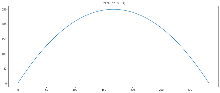 Esto va, en resumidas cuentas, de mejorar la precisión de un sensor (un GPS, p.e.) que proporciona información ruidosa sobre la posición de un objeto que se mueve en el espacio obedeciendo ciertas ecuaciones. En particular, voy a utilizar el caso de un móvil que parte del origen ($x_0 = 0$), con una velocidad inicial de $10$ y que está sometido a una aceleración constante de $-0.3$.