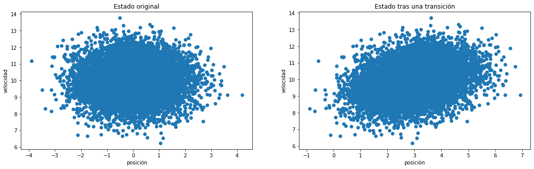 Es decir, hemos pasado de una distribución (normal, por elección) a otra (que también es normal, por las propiedades de esa distribución y la particular forma, una transformación lineal, de las ecuaciones que rigen el movimiento). En este caso particular, podríamos explicitar la media y covarianza de la distribución resultante analíticamente, pero, ¿para qué?