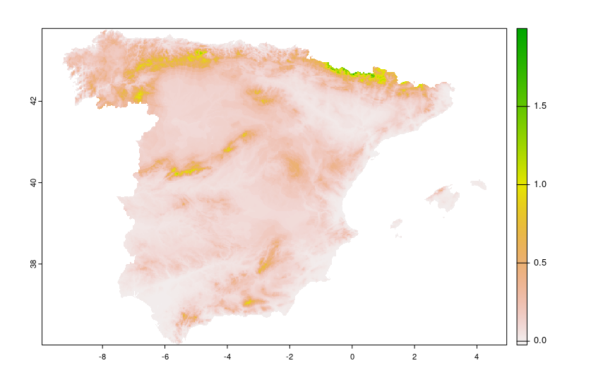 vatios_m2 <- rprep_sup * 9.8 * raltitud / 365 / 24 / 3600