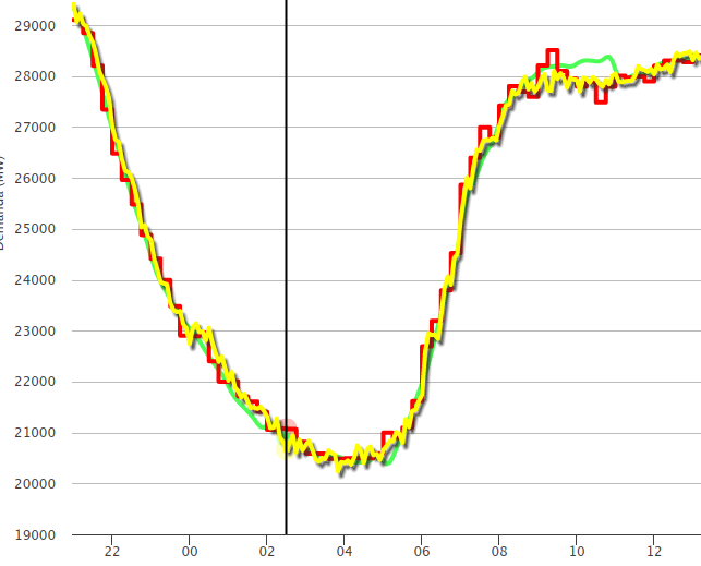 La curva de demanda de electricidad está determinada por la hora nominal: la gente consume poco cuando duerme y conforme pone en marcha los AVEs y las cafeteras, la curva de consumo eléctrico hace cosas tales como:
