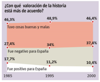 En España, los dos asuntos históricos por excelencia son, como es sabido de todos, lo de Franco y la transición. Sobre el primero, aquí se recoge una infografía elaborada por La Vanguardia usando datos del CIS: