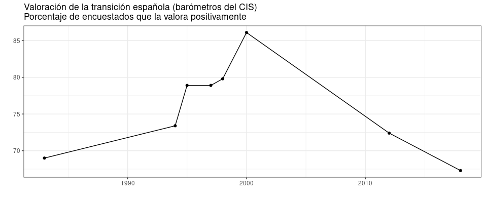 Sobre el nivel de satisfacción con la transición, el CIS ha preguntado en 1983, 1994, 1995, 1997, 1998, 2000, 2012 y 2018 con resultados que recojo en el siguiente gráfico: