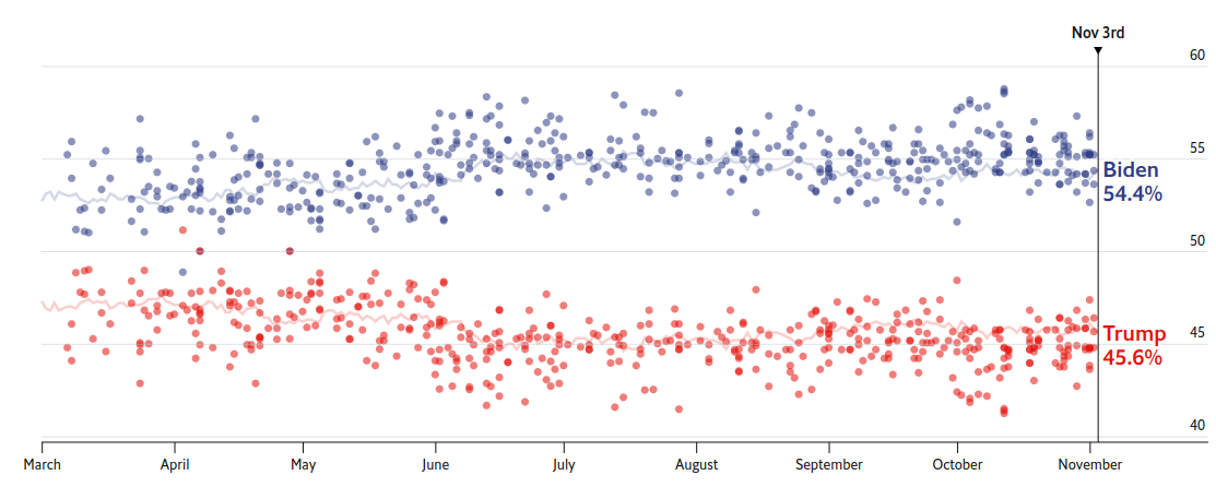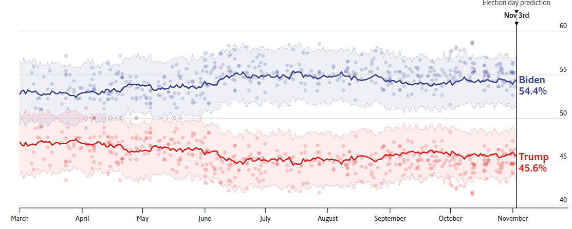 Para abundar en la diferencia, uno puede visitar esta página en The Economist sobre la predicción de las elecciones de 2020. Uno puede consultar las encuestas electorales,