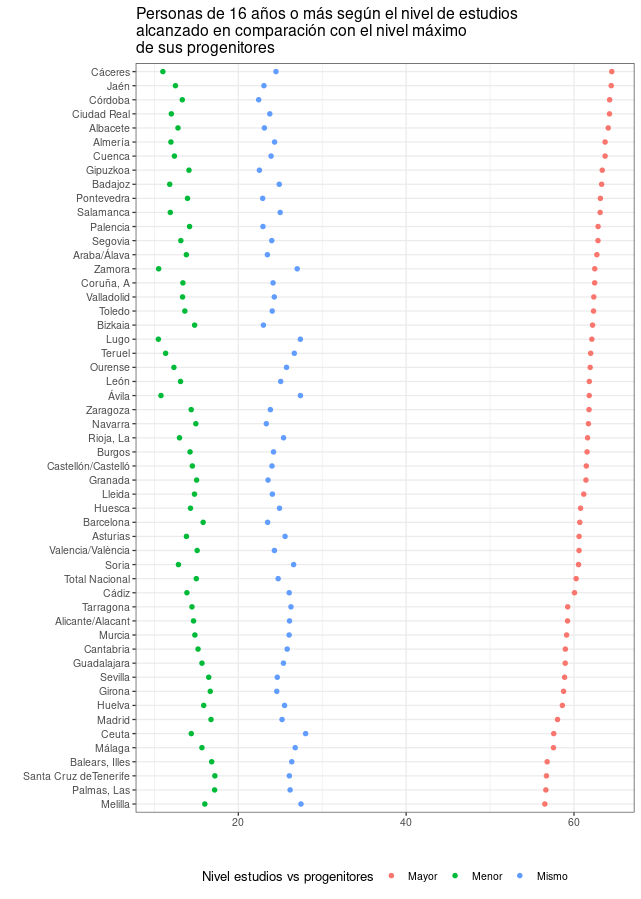 Proceden de la Encuesta de Características Esenciales de la Población y las Viviendas del año 2021 y se refieren a la comparación del nivel educativo de padres e hijos. Oficialmente se refiere a personas de 16 años o más, por lo que a muchos de los hijos no les habrá dado tiempo de ponerse al nivel de los padres, aunque también es posible obtener datos para determinadas franjas etarias.