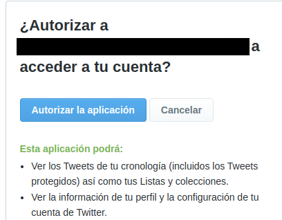 - Para poder tuitear en nombre de terceros y que lo que he contado arriba funcione realmente hay que configurar la aplicación que usa la API de una manera particular y no tengo claro cuál es. Conviene, al crearla, dejar que la intuición guíe al ratón al seleccionar las opciones y confiar en ser acompañado de la fuerza.