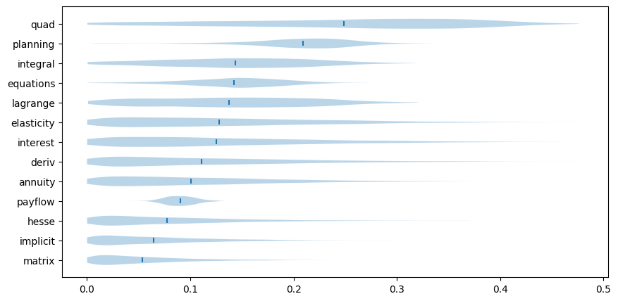 M-step optimizer: BFGScon sus estrellitas de otra época y todo, mientras que el resumen gráfico de las posterioris del ajuste vía numpyro puede consultarse en el enlace anterior. Aviso de que la versión bayesiana transmite mucha menos sensación de certeza sobre el valor de los parámetros, cosa que daría para otra entrada. Por ejemplo, las posterioris de las probabilidades de acertar de chiripa tienen este aspecto: