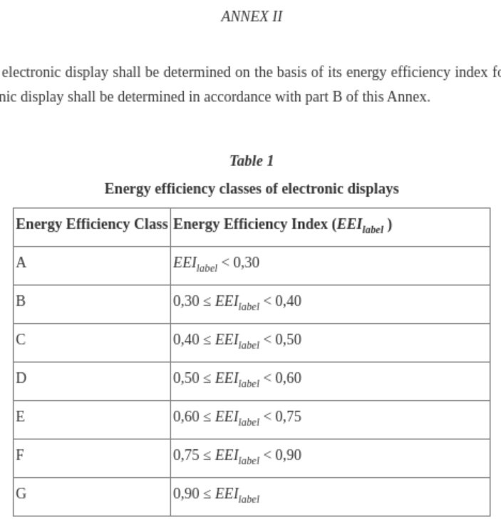Se dictan, más que se explican, en un documento que parece titularse así: Consolidated text: Commission Delegated Regulation (EU) 2019/2013 of 11 March 2019 supplementing Regulation (EU) 2017/1369 of the European Parliament and of the Council with regard to energy labelling of electronic displays and repealing Commission Delegated Regulation (EU) No 1062/2010 (Text with EEA relevance)Text with EEA relevance.