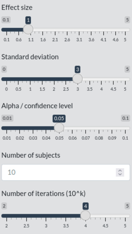 donde se puede determinar el tamaño del efecto, la desviación estándar de los datos, el número de sujetos, el nivel de confianza de la prueba y, finalmente, el número de veces que la prueba se va a iterar, es decir, el número de experimentos simulados que se van a realizar con dichos parámetros.