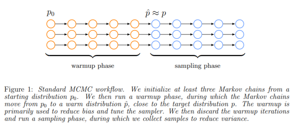 Como se indica en el artículo e ilustra la gráfica anterior, uno lanza varias cadenas que tienen dos fases diferenciadas: calentamiento y muestreo propiamente dicho. Los parámetros iniciales de la distribución de la cadena pueden estar muy alejados de los reales y el calentamiento puede interpretarse casi como una optimización. De hecho, si uno busca en Google mcmc fucntion optimization encuentra resultados relacionados con el asunto. MCMC no está pensado para eso y no es óptimo, pero aun así, puede usarse para obtener valores próximos a un máximo o mínimo.