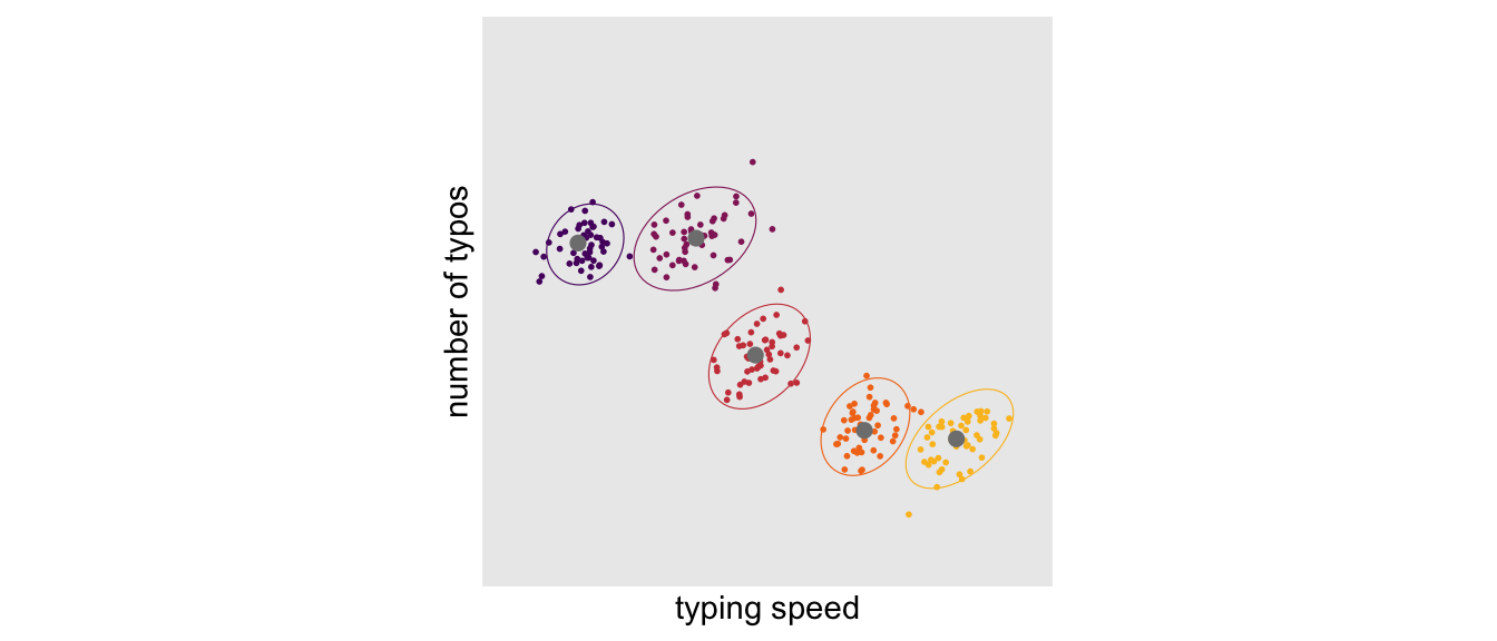 En él se representan individuos (las elipses de colores) sobre los que hay medidas repetidas (las nubes de puntos que contienen) de cierto fenómeno cuantitativo. Lo relevante del gráfico es que:
