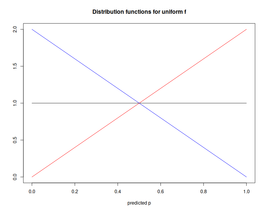 La constante de proporcionalidad en el primer caso es $\int_0^1 pf(p)dp$, obviamente. Si $f(p)$ fuese uniforme en $[0, 1]$, las densidades de los casos positivos y negativos serían distribuciones triangulares: