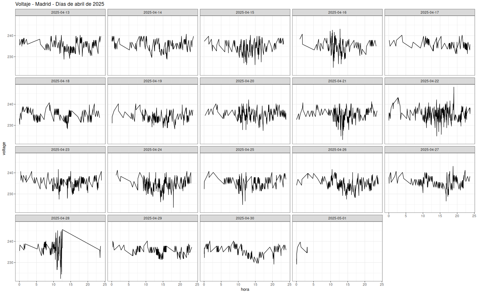 El voltaje en mi casa el día del apagón vs otros días de abril de 2025