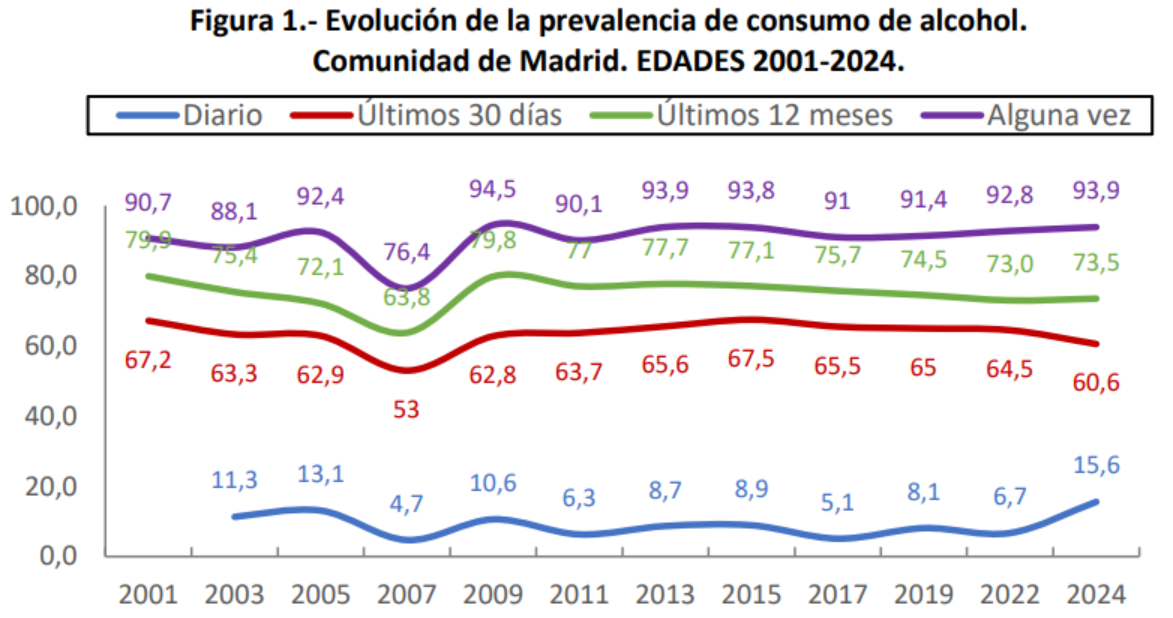 Ese informe se nutre fundamentalmente de los datos de la EDADES (Encuesta sobre alcohol y otras drogas en España), del Ministerio de Sanidad. En el informe correspondiente a la edición de 2024 de dicha encuesta, la palabra “Madrid” aparece 17 veces y en ninguna de ellas se hace referencia a excesos de consumo de alcohol o incrementos del mismo.