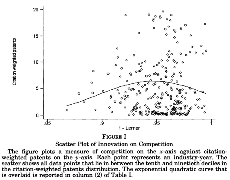 está extraída de un artículo convenientemente titulado Competition and Innovation: An Inverted-U Relationship coescrito por uno de los últimos agraciados por el premio Nobel. Aquí y, especialmente, aquí, se abunda sobre el asunto.
