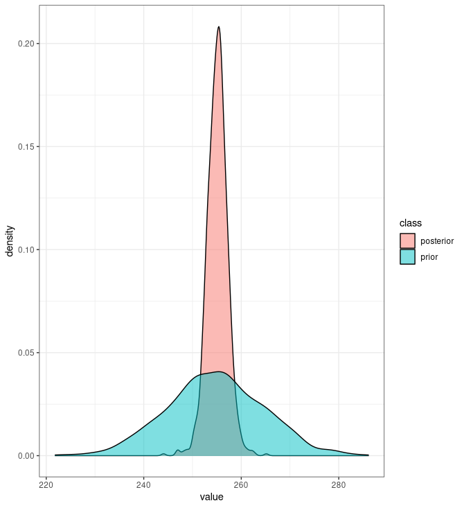 - Consideraremos una priori más o menos razonable para los datos en cuestión. Sabemos que la media no puede estar muy lejos de 255 y que la varianza es relativamente pequeña: tolera errores de un tamaño 2 o 3 como mucho. Esta priori, por supuesto, no sale de la nada: está relacionada con lo que me han contado sobre el problema concreto que quiero resolver.
