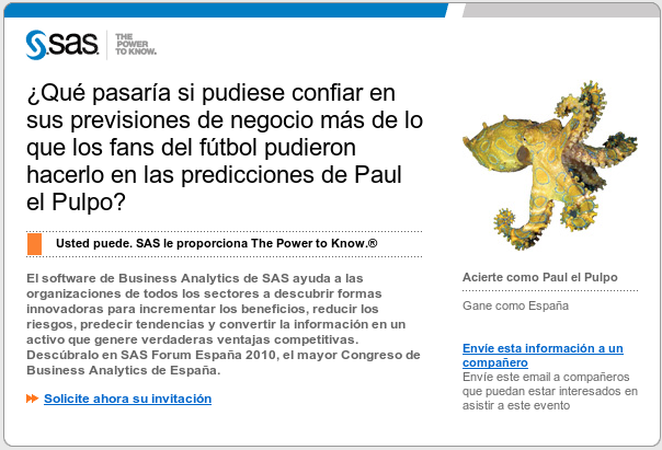 Para el otoño volverá a tener lugar el congreso de usuarios de SAS en España. El anuncio que me acaba de llegar —con su referencia al ubicuo pulpo Paul— no puede ser más desafortunado. Por si desaparece el enlace, reproduzco con una captura de pantalla aquí lo más sustancioso del mismo: