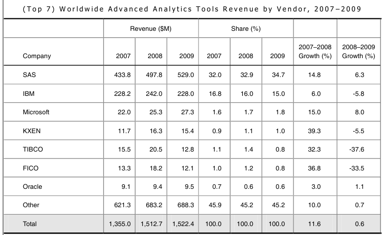 Puede apreciarse cómo en el segmento de la minería de datos (que viene a ser a lo que se refieren con lo de advanced analytics) es SAS el claro dominador con IBM/SPSS en una débil segunda posición.