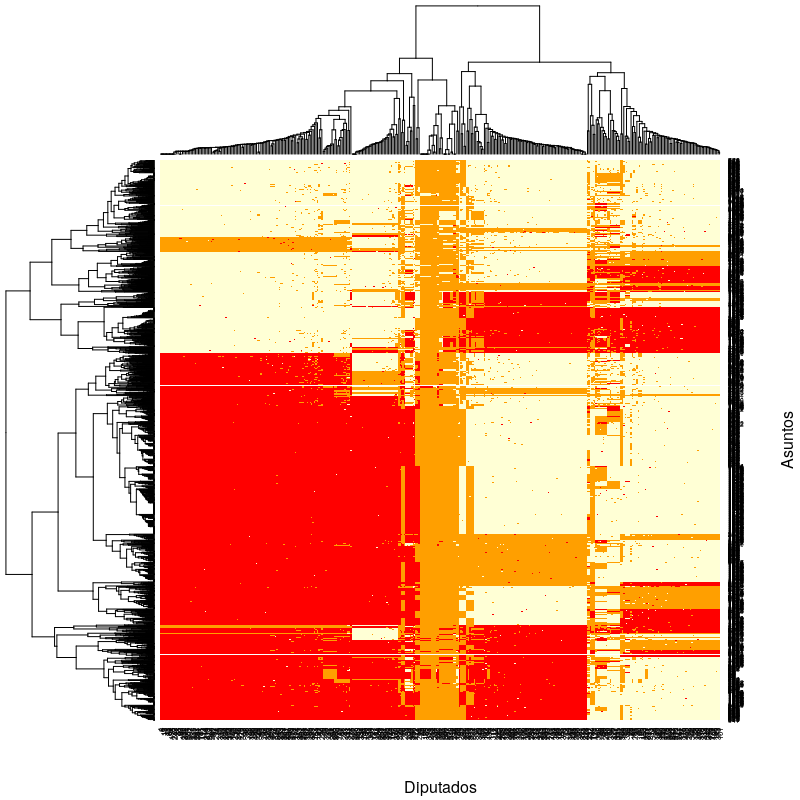 heatmap(matriz_votos, xlab = "Diputados", ylab = "Asuntos", scale = "none")