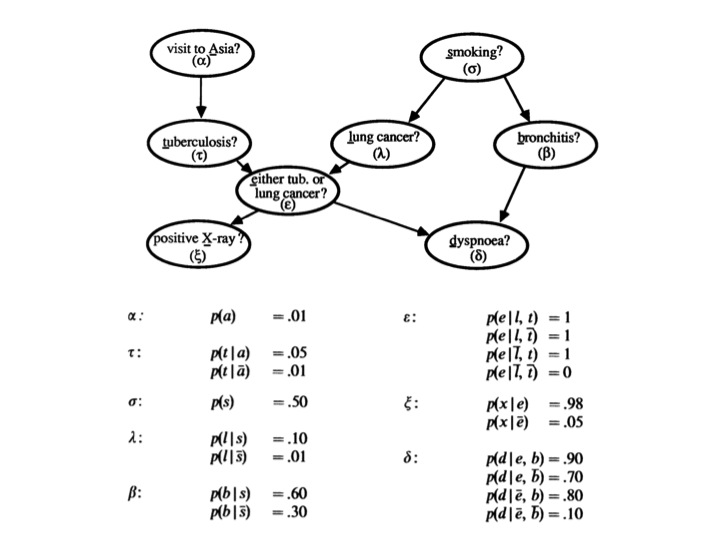 Es decir, una red bayesiana. Una red bayesiana clásica sobre la que los interesados podrán saber más leyendo lo que Lauritzen y Spiegelhalter dejaron escrito sobre ella en 1988.