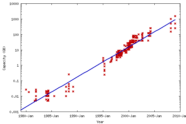 - Aunque la evolución parezca exponencial, en realidad, sabemos que no lo es. Trata de la evolución en capacidad de los discos duros y sabemos que hay límites físicos concretos. Lo que hoy nos parece exponencial, algún día revelará su verdadera naturaleza logística (o similar).