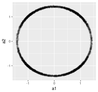 ggplot(res, aes(x = a1, y = a2)) + geom_point(alpha = 0.1)De nuevo, no son intervalos propiamente dichos, lo convengo. Pero son configuraciones más fieles al espíritu de lo que un intervalo de confianza es y representa que su(s) letra(s) I N T E R V A L O.