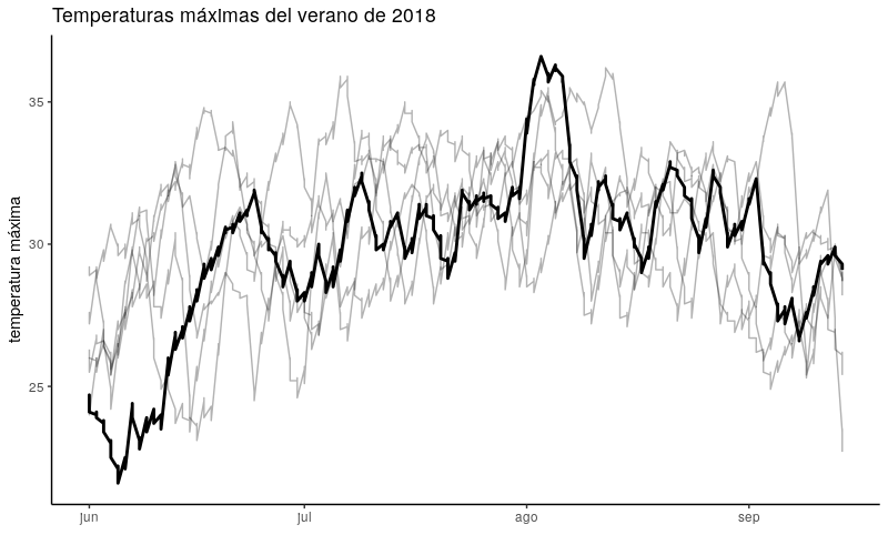 Son las del trazo grueso y las he representado sobre las de los veranos anteriores (trazo fino) para darles contexto. (Nota: no existe tal cosa como temperatura promedio, por supuesto. He partido de temperaturas provinciales (que tampoco existen, en sí mismas pero que proporciona AEMET) y he promediado ponderando por población.)