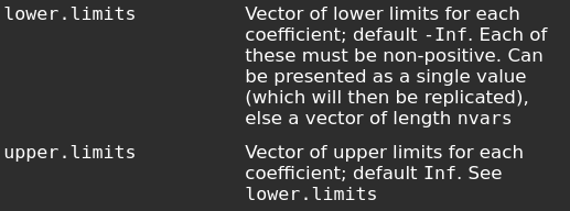 Filosóficamente, es un tanto sorprendente: de alguna manera, glmnet es glm con prioris alrededor del cero. Los límites superiores e inferiores permiten introducir información a priori adicional no necesariamente compatible con la anterior.