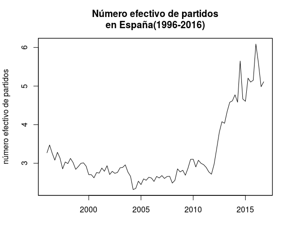 plot(res, main = "Número efectivo de partidos\nen España(1996-2016)",