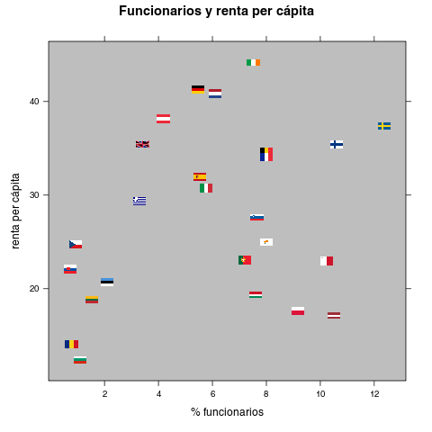 Ahora combino ambas entradas y algo más de mi cosecha para mostrar un gráfico hecho con R utilizando símbolos arbitrarios (las banderas de cada país).