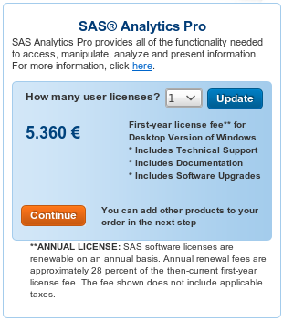 Existe un producto específico de SAS, SAS Analytics Pro, que incluye los elementos más habituales del universo SAS (SAS/BASE, SAS/STAT, SAS/GRAPH, etc.) que sólo cuesta