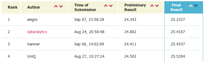 He logrado la segunda posición en la primera de ellas (usando R, obviamente) y espero redactar pronto un informe sobre la estrategia y métodos utilizados de cara a su posible publicación en las actas de la IEEE International Conference on Data Mining 2010 (ICDM10), que tendrá lugar en Sydney en diciembre.